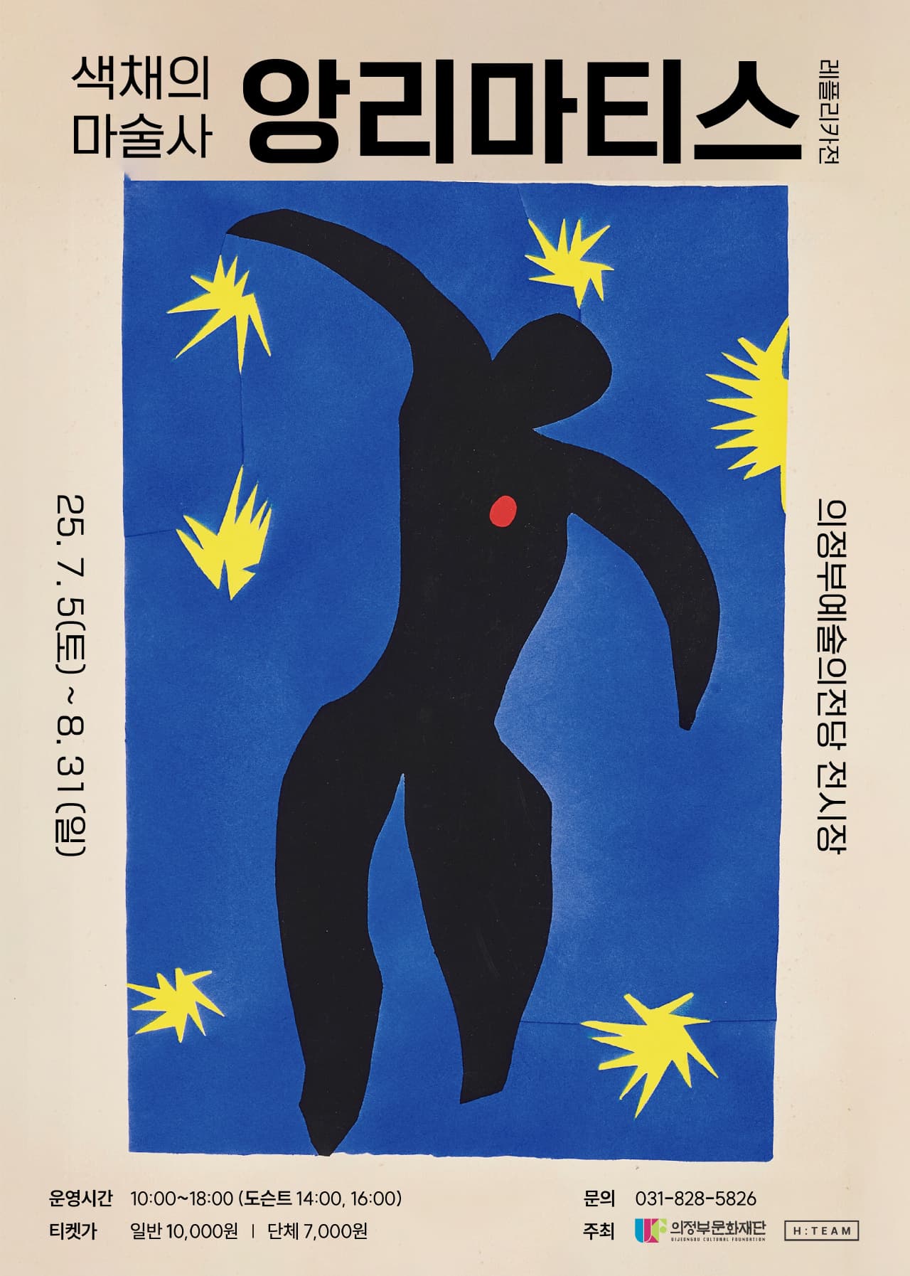 이번 전시는 의정부예술의전당에서 열리는, 앙리 마티스의 대표작을 생생하게 체험할 수 있는〈색채의 마술사: 앙리 마티스 레플리카전〉입니다.전시 정보전시명: 색채의 마술사: 앙리 마티스 레플리카전기간: 2025년 7월 5일(토) ~ 8월 31일(일)장소: 의정부예술의전당 전시장휴관일: 매주 월요일관람 시간: 오전 10시 ~ 오후 6시 (입장 마감 17:30)일반 티켓: 10,000원 (성인·청소년 동일)작가 소개 : 앙리 마티스 (1869 -1954)20세기 현대 미술을 대표하는 프랑스 화가입니다. 그는 강렬하고 대담한 색채 사용으로 ‘야수파(Fauvism)’를 주도하며 색채의 마술사라 불렸습니다. 단순화된 형태와 리듬감 있는 구성으로 감정과 자유를 표현하며, 후기에는 종이 오려붙이기(collage) 기법으..